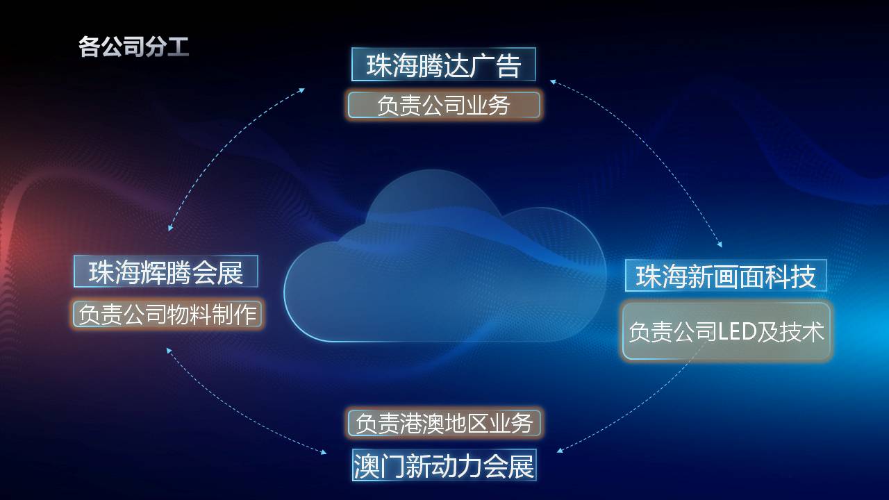 公司为了更好的为广大客户服务,成立了以腾达广告为主,珠海新画面科技技术支持,珠海辉腾会展制作支持,澳门新动力港澳配合工作的工作架构。分工明确,快速灵活的为客户服务。